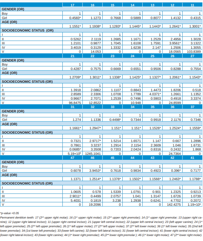 In relation to the sequence the first tooth to emerge when the purchasing level is higher, are the mandible incisors, while in population with less resources the first mandible molars35 erupt first. In our research, no statistically significant differences were found in this regard, observing how in the first quadrant the probability of the lateral incisor emerging was approximately four times greater for individuals of social class III. The same would occur in the second quadrant with the second premolar. At the third quadrant level, the probability of the lateral incisor appearing was multiplied by three for social class II and by fifteen for the central incisor appearing for social class IV. Finally, at the fourth quadrant level the piece 46 would have a probability of emerging three times higher for the social class III. Colomé et al. emphasize in their study that the first tooth to emerge is also the lower central incisor, followed by the first lower molar38. However, Valenzuela et al. determined that the first tooth to erupt in its structure was the first molar both upper and lower30.