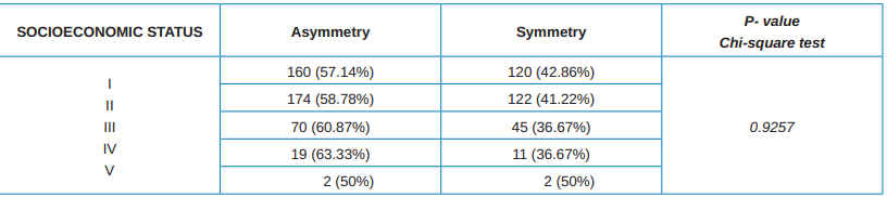 The eruption symmetry was presented in 41.38%, being significantly higher the percentage of subjects without symmetry (68.62%) (p-χ2 <0.001). The presence of symmetry in the upper arch was significantly related to that of the lower arch (p-χ2<0.001), being present in 67.87% of the children. Asymmetry in the upper and lower arch simultaneously was found in 71.38% of the sample. No significant results were found in the relationship between sex and eruption symmetry (p-χ2=0.582) or between race and symmetry (pχ2=0.5901). There was also no significance between eruption symmetry and socioeconomic status (pχ2=0.9257) (Table 2).