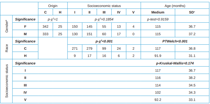 Results: Regarding the socioeconomic status, 38.62% were Level I, 40.83% Level II, 15.86% Level III, 4.14% Level IV and 0.55% Level V. The first tooth to appear in the maxilla was the first molar (74.34-76.41%), while in the mandible it was the central incisor (78.9-82.76%) with statistically significant differences (p-χ2 <0,001).