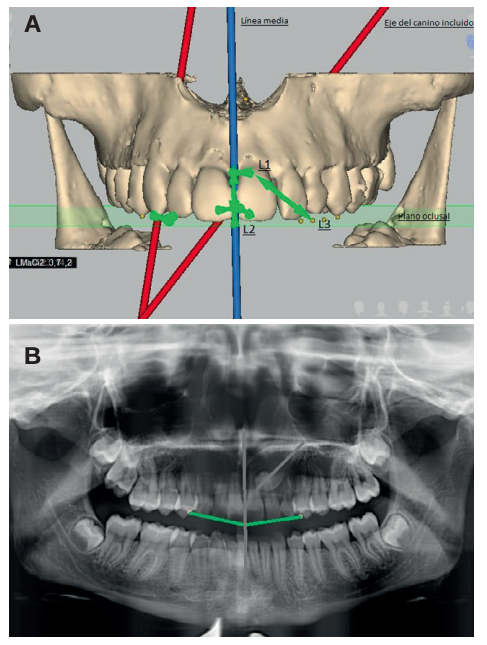 Methods: An orthodontic study of the maxilla using orthopantomography with cone beam computed tomography (CBCT) at the Madrid European University Clinic was performed on 27 patients selected with 36 maxillary impacted canines. Three reference lines were drawn based on the distance from the cusp of the canine to the occlusal plane (L1), to the midline (L2) and to its ideal eruption site (L3), in both the orthopanthomography and the CBCT. As ideal reference values, we selected a control group of 36 erupted maxillary canines.
