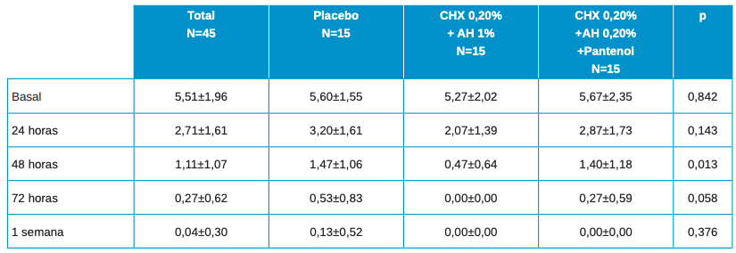 Resultados: En relación al dolor postoperatorio no encontramos diferencias estadísticamente significativas en ninguno de los grupos analizados. En relación a la cicatrización el grupo en el que se aplicó ácido hialurónico 1% junto con clorhexidina 0,20% fue el que mejores resultados ofreció desde un punto de vista estadístico en las primeras 24-48h con respecto a los otros dos.