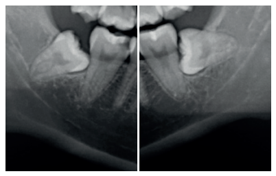 Caso clínico: Se presenta un caso clínico de una mujer de 27 años de edad, sin antecedentes médico-quirúrgicos de interés, que acudió al Servicio de Cirugía Bucal e Implantología de la Facultad de Odontología de la Universidad Complutense de Madrid para la exodoncia de los terceros molares inferiores. Una vez realizada la Historia Clínica, se le realizó la exodoncia del tercer molar inferior izquierdo en posición horizontal con regeneración con dentina autógena, y el tercer molar inferior derecho de manera convencional, haciendo un seguimiento de 6 meses para comparar la evolución de ambos lados.
