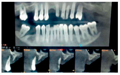 Tras la exploración clínica y radiológica mediante radiografías periapicales y tomografía computerizada de haz cónico (CBCT) se decide realizar un abordaje combinado endodóntico-quirúrgico.