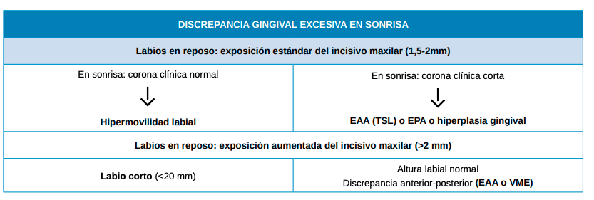 La etiopatogenia de dicha condición se resume en tres facetas: dentoperiodontal (erupción pasiva alterada y erupción activa alterada), ósea (esquelética y/o dentoalveolar) y muscular (labio superior corto e hipermovilidad labial).