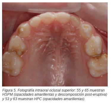 semana de gestación4-7. Se presenta el caso de un paciente infantil, de 6 años, que acudió a consulta para revisión odontológica. Tras la exploración, se observó la presencia de anomalías del color y estructura en: todos los segundos molares y caninos temporales, así como en los primeros molares temporales superiores y primer molar temporal inferior izquierdo (Figuras 1-6). La posterior exploración radiográfica mostró hallazgos patológicos localizados en 54, 64, 65, 74, 75, 84, 85 (Figuras 7-9). El tratamiento supone un desafío ya que es frecuente que los dientes afectados presenten afectación pulpar, además de hipersensibilidad y descomposición post-eruptiva. Esta relación podría sugerir como factor predictivo de aparición de HIM, la presencia HSPM y HPC, así podrían implementarse las medidas de prevención y control con intervalos más frecuentes en estos pacientes.