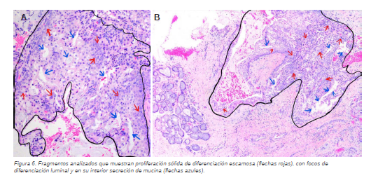 derecho de aproximadamente 7 meses de evolución. Su historial médico no refiere ningún antecedente personal ni familiar de especial importancia. En el examen clínico extraoral no se encontró ningún hallazgo patológico de interés, e intraoralmente presentaba una lesión tumoral con forma irregular y superficie lisa, localizada en el trígono retromolar derecho, de color rojo parduzco, de consistencia blanda y dolorosa a la palpación. Se solicitó radiografía panorámica en la cual no se observó ningún hallazgo patológico, por lo que se procedió a realizar una biopsia incisional para su estudio histopatológico. La histopatología reveló la presencia de fragmentos con una proliferación neoplásica maligna en la que se reconocen células claras de aspecto mucoso, estructuras glandulares y otras con cierta disposición