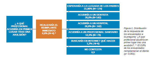 Resultados y Discusión: El reimplante inmediato fue la opción elegida por el 0,8% de los encuestados (p= 0,001). Solo el 3,47% respondió que el diente avulsionado “debe cogerse por la corona, no cepillarse, guardarlo en leche, suero fisiológico o saliva del propio paciente y acudir