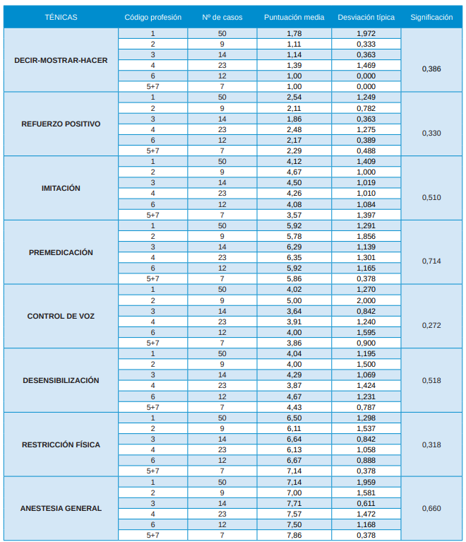 Resultados: La técnica más utilizada por los diferentes profesionales fue la técnica decir-mostrar-hacer seguida de refuerzo positivo y control de voz. Técnicas de modificación de la conducta ocuparon un segundo término: desensibilización seguida muy de cerca por imitación. La técnica menos empleada fue la anestesia general. No encontramos diferencias significativas en relación al sexo en ninguna de las técnicas analizadas excepto en el uso de premedicación (p: 0,027), siendo los varones los que más frecuentemente la utilizaban. No se encontraron diferencias significativas en relación a la especialidad ni con la edad de los profesionales.