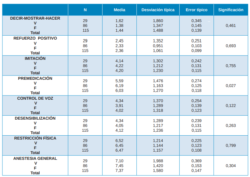 Material y método: Se realizó un cuestionario en la plataforma de Google, remitido vía email a 190 odonto/estomatólogos que tratasen pacientes infantiles, obteniendo un total de 115 respuestas adecuadas para el análisis de 8 técnicas convencionales de manejo de la conducta. El estudio estadístico se realizó en el programa SPSS aplicando el test de ANOVA para una significación de p= 0,05.