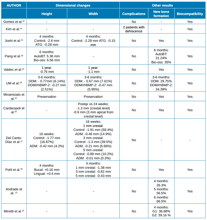 Results: A total of 12 studies were included in the systematic analysis. The dimensional changes, after grafting with particulate dentin, were comparable to those of other biomaterials and fewer than in the control groups. The occurrence of complications was low. New bone formation and re-entry time were similar to other biomaterials.