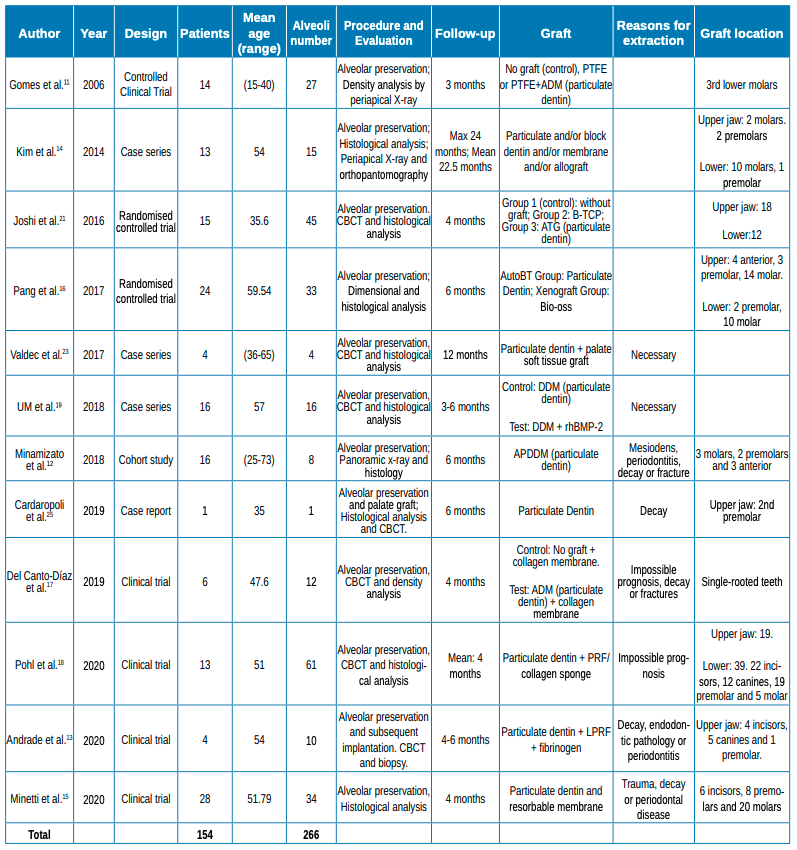 Materials and method: A review of the relevant literature in the PubMed and MEDLINE databases was carried out, identifying studies evaluating alveolar preservation procedures with particulate dentin in human patients with recorded follow-up.