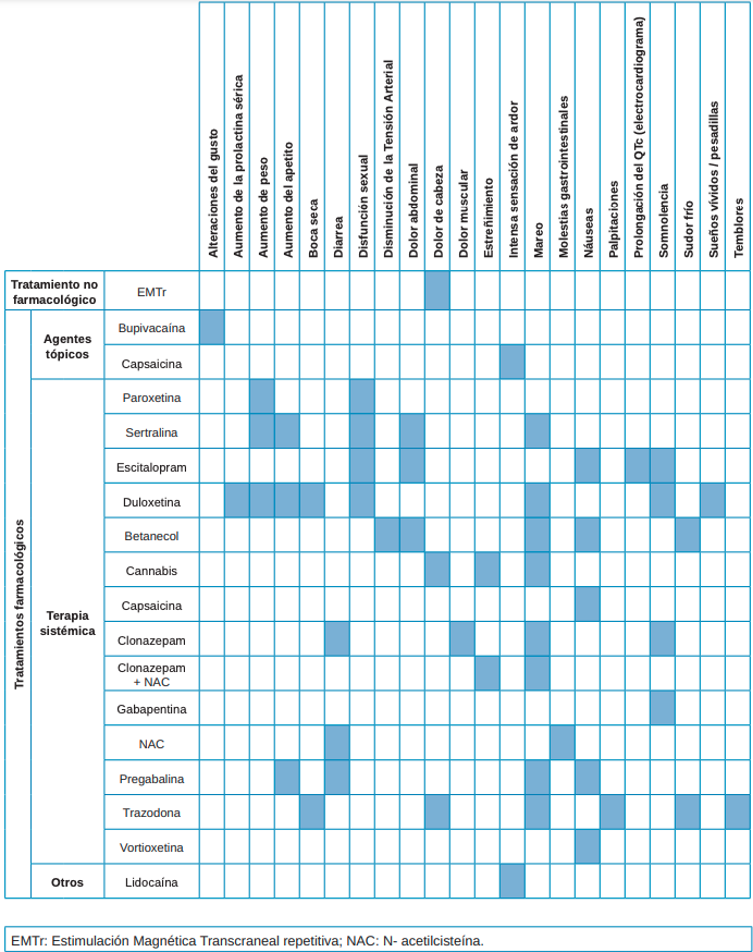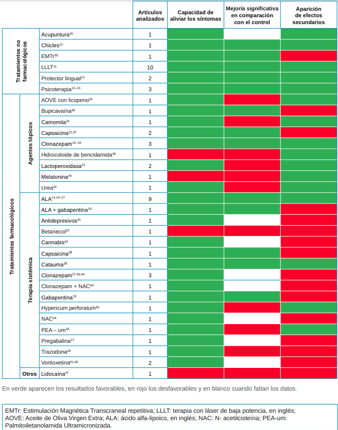 Resultados: En la primera línea de tratamiento encontramos los chicles, la LLLT (terapia con láser de baja potencia, en inglés), el protector lingual, la psicoterapia, clonazepam tópico, ALA (ácido alfa-lipoico, en inglés) y la Catauma.