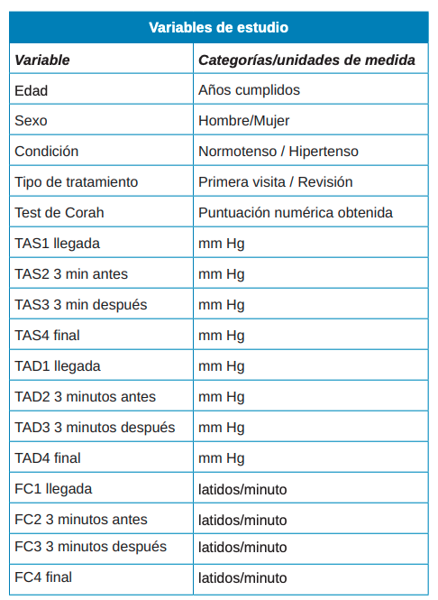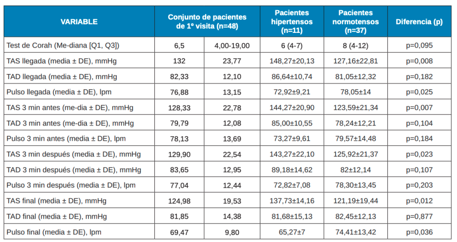 Se realizaron 48 primeras visitas; el 35,42% eran hombres y el 64,58% mujeres, con una edad de 44,79 ± 16,49 años. La puntuación del test de Corah tiende a ser superior en los pacientes hipertensos en pacientes de primera visita, y la edad es significativamente mayor en hipertensos. En el conjunto de pacientes de primeras visitas, la TAS y el pulso variaron a lo largo del procedimiento, siendo inferiores al final. No se observó esta diferencia en cuanto a la TAD.
