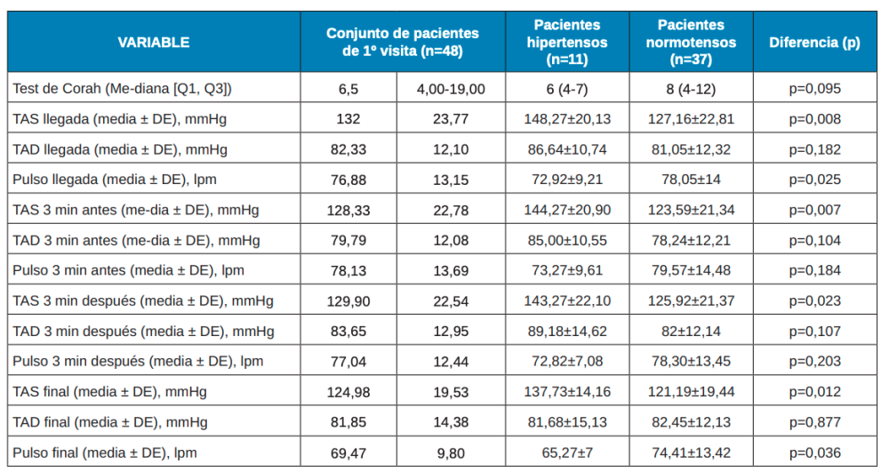 La puntuación del test de Corah tiende a ser superior en los pacientes hipertensos en pacientes de primera visita, aunque la diferencia no es estadísticamente significativa. La TAS a la llegada fue superior en hipertensos (p=0,008), 3 minutos antes (p=0,007), 3 minutos después (p=0,023) y al finalizar (p=0,012) respecto a los pacientes normotensos siendo todas las diferencias estadísticamente significativas.