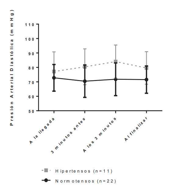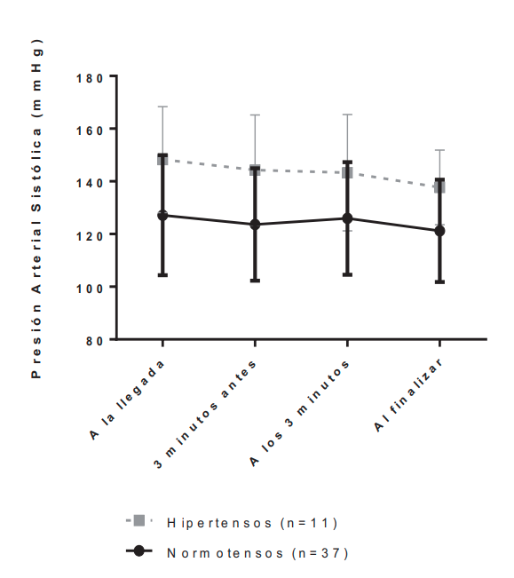 Forty-eight first visits were performed; 35.42% were men and 64.58% women, with an age of 44.79 ± 16.49 years. The Corah test score tended to be higher in hypertensive patients in first visit patients, and age was significantly higher in hypertensives. In the set of firstvisit patients, the ASR and pulse varied throughout the procedure, being lower at the end. No such difference was observed for DBT.