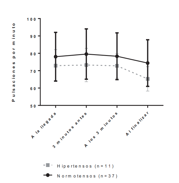 Al hacer el mismo análisis para la evolución del pulso, se observó que el pulso difería de forma estadísticamente significativa entre los puntos temporales (F (3, 93) =7,30; p<=0,001). Las pruebas post hoc utilizando la corrección de Bonferroni revelaron que el pulso era inferior al finalizar el procedimiento que a la llegada y a los 3 minutos antes de empezar el procedimiento. Al analizar por separado pacientes hipertensos y normotensos, se observó que en pacientes normotensos el pulso no difería entre los distintos puntos temporales; pero sí lo hacía en pacientes hipertensos (p=0,017), siendo inferior al finalizar (Figura 6).